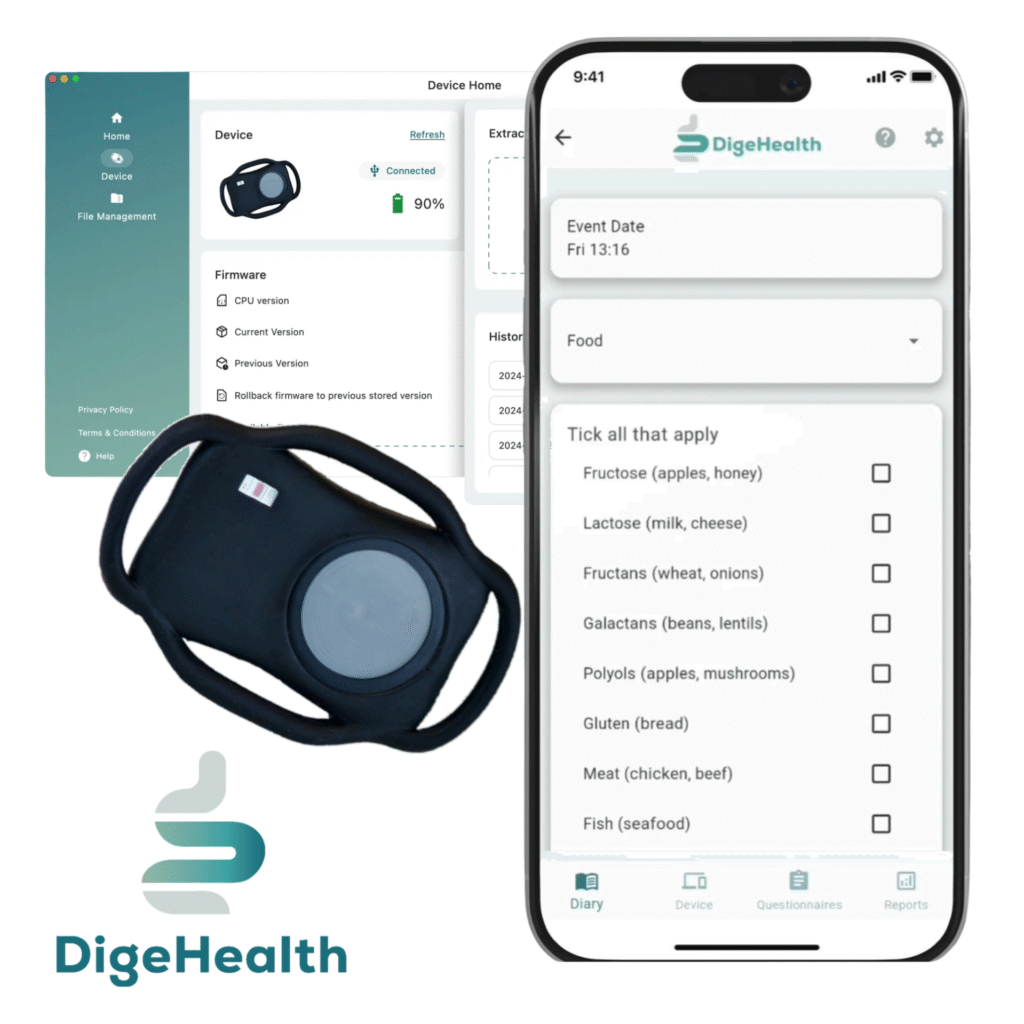 DigeHealth هي منصة DTx مخصصة لمرضى الجهاز الهضمي، تجمع بين جهاز تتبع طبي ذكي ومعلومات يقدمها المريض ونماذج بيانات مدعومة بالذكاء الاصطناعي من أجل مراقبة شاملة ورؤى متعمقة.