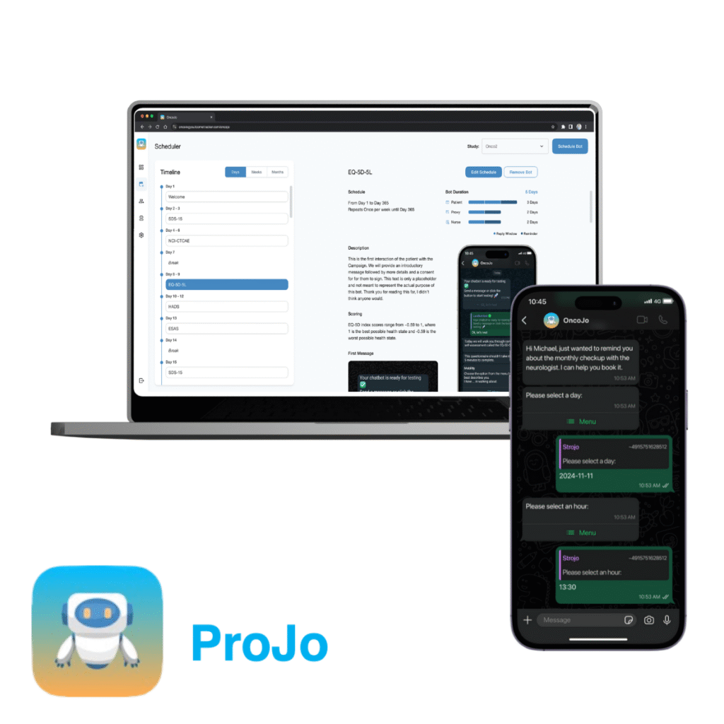 ProJo هو روبوت دردشة وأداة مراقبة موجهة للمرضى تتيح جمع البيانات بسلاسة وفي الوقت الفعلي في التجارب السريرية والممارسة العملية، مما يحقق اكتمال البيانات بنسبة 97٪ دون أي جهد يدوي.